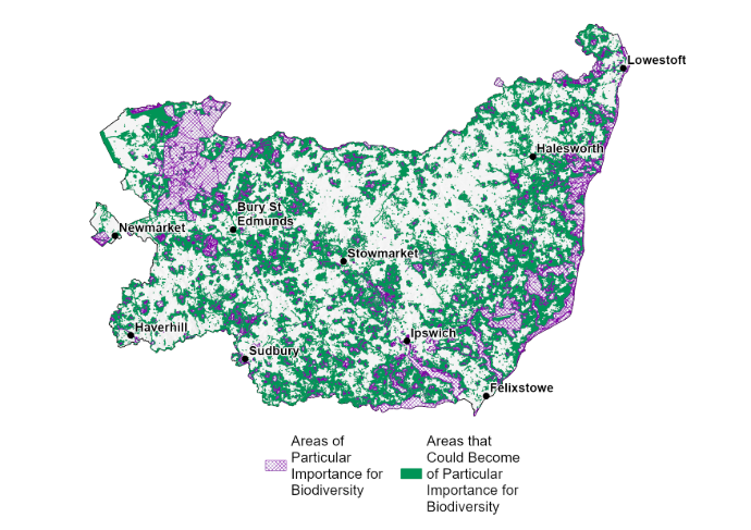 As part of the strategy a map of Suffolk has been created. This shows where Suffolk’s existing nature-rich spots are (Areas of Particular Importance for Biodiversity or APIB) and areas that could become nature-rich if recovery work takes place (Areas that Could become important for Biodiversity or ACB). The majority of areas designated as ACB surround the existing good places or are identified due to their potential for biodiversity. This is to ensure wildlife is not limited to isolated places and can instead spread throughout the county through corridors.